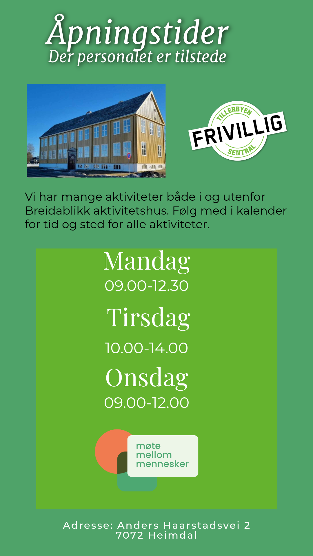 Tillerbyen frivilligsentral. Nå er vi kommet oss godt til rette i lokalene til gamle Breidablikk skole. Det vil nå hete "Breidablikk Aktivitetshus". I tillegg til denne siden vil det være mulig å følge oss på FB, Tillerbyen frivilligsentral.